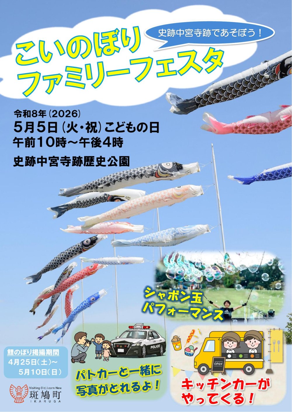 年別アーカイブ: すべて表示 2026年 2025年 2024年 2023年 2022年 2021年 2020年 2019年 2018年 2017年 2016年 カテゴリー: すべて表示 お知らせ ニュース トピックス 催事 お知らせ 2026.04.22 こいのぼりファミリーフェスタ イベントのお知らせ お知らせ 2026.04.15 4月26日 日曜日 楽しいイベント開催です! お知らせ 2026.03.25 トイレ改修について お知らせ 2026.01.20 法隆寺iセンター節分祭 お知らせ 2026.01.10 1月11日~15日 ボランティアガイド・駐車場について お知らせ 2026.01.01 新年のご挨拶 お知らせ 2025.12.30 いかるが茶房年末年始特別メニューのお知らせ お知らせ 2025.11.25 斑鳩の里グルメMAP お知らせ 2025.11.08 ボランティアガイド 年末年始のお知らせ お知らせ 2025.10.10 親子で参加 「藤ノ木古墳カレー」づくり体験☆彡 123NEXT >