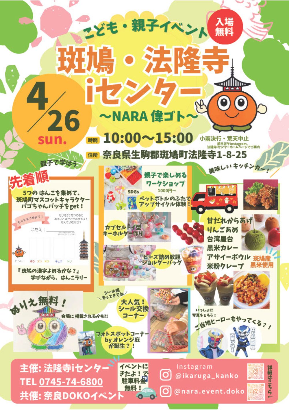 お知らせ 2026.04.15 4月26日 日曜日 楽しいイベント開催です! 4月26日 日曜日 法隆寺iセンターで、こども・親子イベント~NARA偉ゴト~を開催します!楽しいイベントがたくさんあります。26日は法隆寺iセンターでお待ちしていますパゴちゃんも登場するよ! < 前の記事